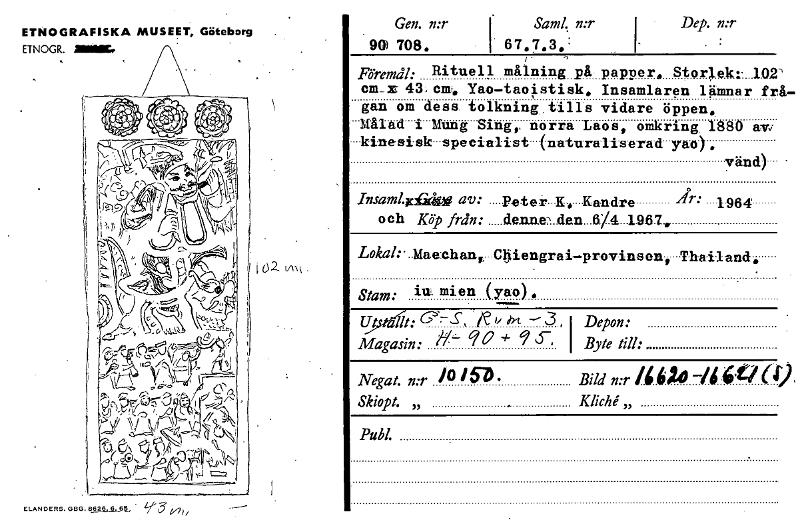 ETNOGRAFISKA MUSEET, Göteborg ETNOGR. vi■k ELANDERS. GBG. 8626. 8. 65, 171- t/),, Gen. n:r 90) 708. . Sam/. n:r i 67.7.3.: I Dep. n:r I- . - Föremål: Rituell målning på papper, Sto4ek:,. 102 cm...x: 43. cm,„ Yao—taoistisk. Insamlaren lämnar fr gan om dess tolkning tills vidare öppen„ -Målad i Mung Sing,, norra Laos, omkring 1880 av; . kine-sisk specialist (naturaliserad ytto) . vänd) insaidiefzi4 av: Peter K. Kandre jr: 1964 och Köp från: denne'.den 6/4 1987.. Lokal:• Maechan y, Chiengrai—provinsen, Thailand„ Stam: iw mien (yao) „, Ut it: 6--:"---f, /e1) bl —3, Magasin: 90 + 93.-. i Depon: I Byte till: Negat. n:r i° i 5 7) • Bild n:r li40241 —a 6'0' (J Skiopt. „ . Klichl, „ Pub4 • å— [ocr]