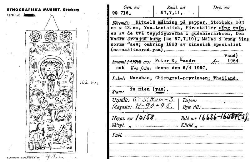 ETNOGRAFISKA MUSEET, Göteborg ETNOGR. 1111111111e. 102_ ELANDERS. GBG. 8626. 6. 65 irj/ - Gen. n:r 90 716. . Saml. n:r i . 67;7.11. .. Dep. n:r I Föremål: Rituell Målning cm x: 43 cm, Yao-taoistisk. en av de. två toppfigurerna andra ar,.niud hung (se 67.7.10). på papper. liandre 6/4 196,7. FöreställerStorlek::.102 sing tsiu i. gudahierarkien„ Der Målad i 'Mung Si vänd) År; 1964 norra Laiya,,, omkring:.-1880-av-kine-sisk-specialist.. ..(natural.i.s.e.rad..yao). Insaml~ av: . Peter K. och Köp från: denne.: den Lokal: Mae.chan" Chiengrai-prpvinsen: Thailand, iu. mien (yao) . Stam: Ut allt: "6'.- Ss, rev m- —3 , agasin: 9 a + 9 5, , .. i Depon: . ;- I Byte till: Negat. n:r /öar • Bild n:r /6 G.14-1~ Skiopt. „ Kliché,, Publ. ng [ocr]