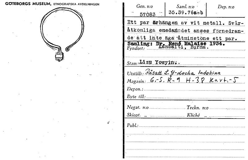 • GOTEBORGS MUSEUM, ETNOGRAFISKA AVDELNINGEN Gen. n:o Sam!. n:o Dep. n:o - 57683 35.39.76a,b Ett par örhäng en av vi t metall. Svår- åtkomliga emedafin det anses förnedran- de ått inte.äga —åtminstone... Visa hela