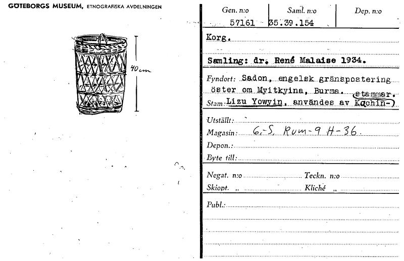 • GOTEBORGS MUSEUM, ETNOGRAFISKA AVDELNINGEN Gen. n:o Samt. n:o 57161 - 35 '..39 .154 Dep. n:o Korg. eznling: dr...Rend Malaise 1934. Fyndort: ..Sadon., eng.elsk...gr.änSpo.s.tering öster om My.ltk,yina... Visa hela