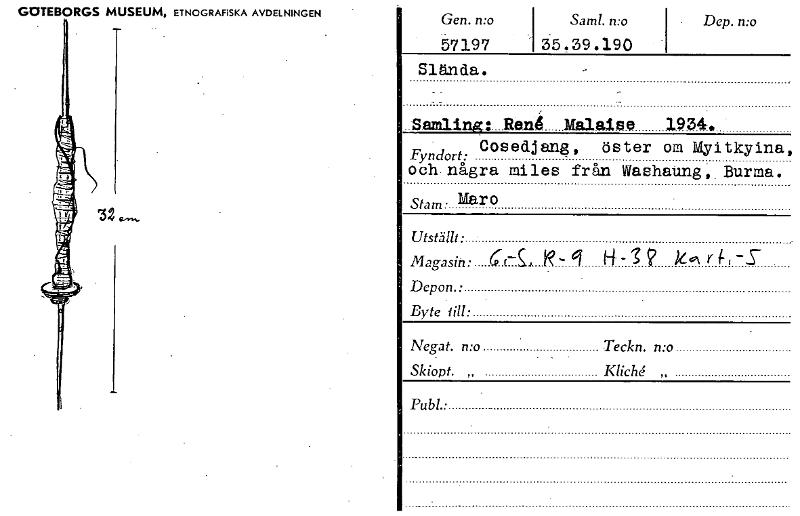 GOTEBORGS MUSEUM, ETNOGRAFISKA AVDELNINGEN Gen. n:o 57197 Slända. Samt. n:o 35.39.190 Dep. mo _Samlingt_Renå MAlaise 1934. Fyndort: Cosedjang, öster om Myitkyina, och.några miles från Washating,.Burm...