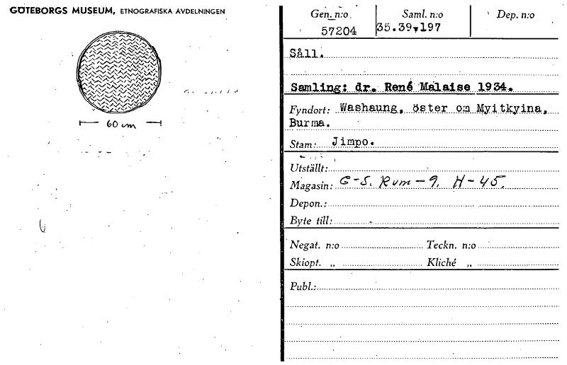 GOTEBORGS MUSEUM, ETNOGRAFISKA AVDELNINGEN .•-• •;'ii t- 60 t6v .■ Gen. n:o 57204 Anis Samling: dr. Rant; Malaise 1934, Fyndort: Washaung, öster om Myitkyina, Burnia. Stam Jimpo. Utställt: Magasin...