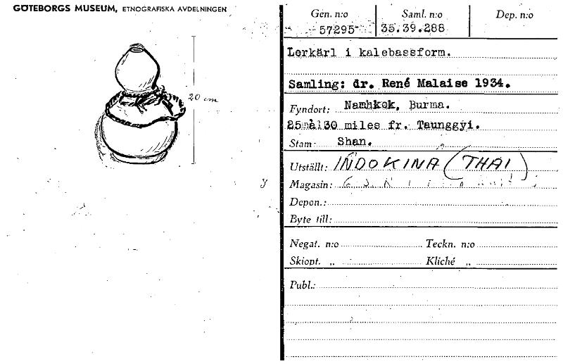 • GOTEBORGS MUSEUM, ETNOGRAFISKA AVDELNINGEN y Gen. n:o Saml. n:o ... . -57295 35. 3.288 Lerkärl i kalebaseform. Samling: dr, Ren0 Malaise 1934. Fyndort: NaLtka, Durma. 2.521150 ml les fr.- Taunggyi. ... Visa hela