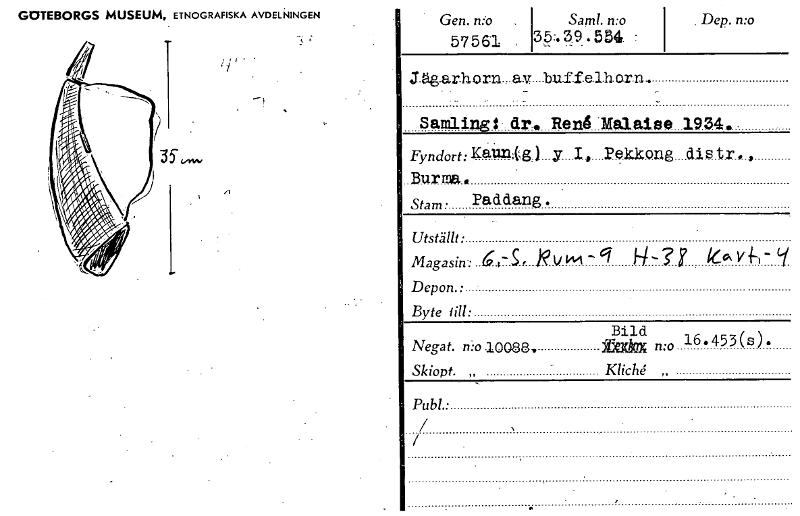 GOTEBORGS MUSEUM, ETNOGRAFISKA AVDELNINGEN t' Gen. n:o 57561 • Samt. tro 35:.39.54 : . Dep. n:o Jägarhorn_av buffelhorn. Samling Ren4 *Mal.aise .19.34. • Fyndort: Ka11114 i y I, Pekkong tr , , Burma Stam . Paddang. Utställt • Magasin: 6. S• frti ? 160 41- (I Depon.: Byte il!: Bild n:o 16.453(s)• Negat. n:o 10088, „ Skiopt. „ - Kliché Publ.: [ocr]
