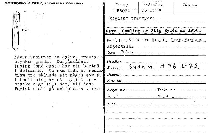 GOTEBORGS MUSEUM, ETNOGRAFISKA AVDELNINGEN 1 1. Några indianer ha dylika träf,.t7.2.k stycken gömda. DelgåteAtt- Payiak Ond ande) har sin bostad i detsam2a. De som lida av reuma tism tro sålunda. att någon som är i besittning av ett dylikt trä- stycke sagt till.det, att dess Payiak skall gå och:orsaka värken Dep. mo Magiskt trästycke. Gåva. Samling av Stig Rydén år 1932. Fyndort: Sombrere.Negro, rrov.Formosa, krgantina. stam. Toba. Utställt : Magasin: S (i 61. ok. , - "7- 2, Depon.: Byte till: Negat. n:o Teckn. n:o Gen. 73.9 -5-3-074 • Sam!. n:o -3..37-17696 Skiopt. KlicU „ Publ.: [ocr]
