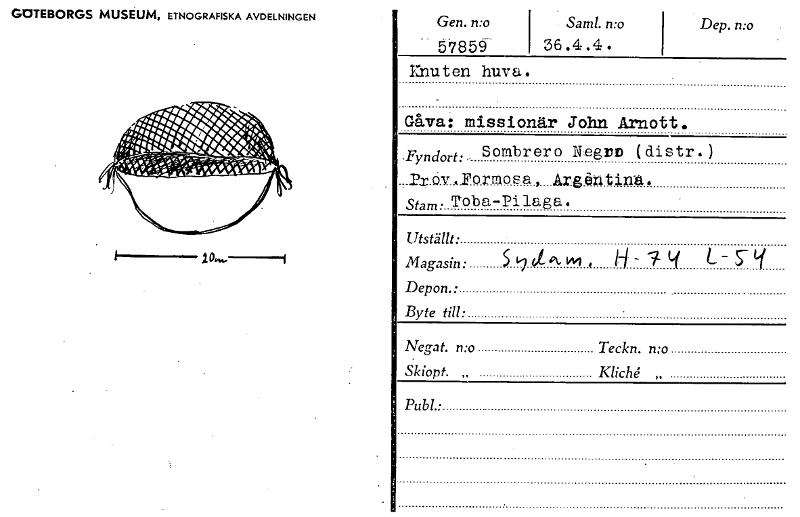 • GOTEBORGS MUSEUM, ETNOGRAFISKA AVDELNINGEN Gen. n:o Saml. n:o 57859 36.4.4. rhuten huva. Dep. n:o Gåva: missionär John Arnott. Tynclort:- Sombrero Negrv (distr.) Stam: Poba-Pilaga. Utställt • Magas... Visa hela
