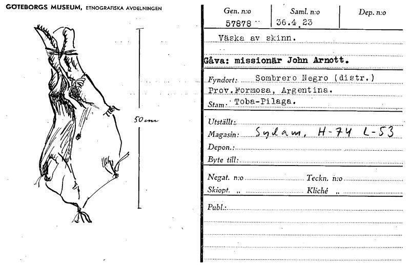 • GOTEBORGS MUSEUM, ETNOGRAFISKA AVDELNINGEN 3-0 Gen. n:o 57878 Samt. n:o 36.4.23 Väska av skinn. Gåva: missionär John Arnott. _Fyndort: Sombrero Negro (distr.) ProV.Pormosa, Argentina. • Utställt • Mag... Visa hela