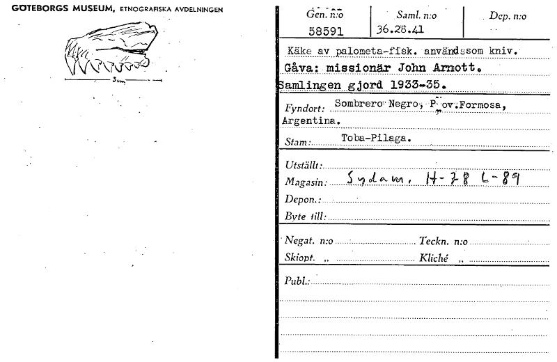 • GOTEBORGS MUSEUM, ETNOGRAFISKA AVDELNINGEN —4 tn, Gen. n:o Saml. n:o 58591 36.28.41 Käke av palometa-fisk.-användssom kniv.• Gåva: missionär John Ar:lott. amlingen gjord 1933-35. F ndort: Sombrero,N... Visa hela