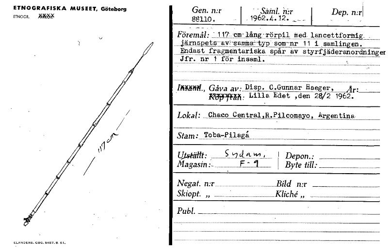 ETNOGRAFISKA MUSEET, Göteborg ETNOGR. krfä? ELANDERS. GBG. 5687. 8. 61. Gen. n:r 88110. _. i ' - Såml. n:r _ 1962.4.12. ___ Dep. n:r i Föremål: - 117-__m-lång.-rörpil Med. _____järnspets-av=-samina':...