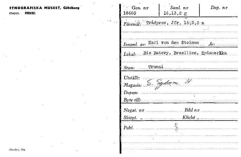 • Gen. n:r Saml. n:r 18460 16.13.2 g Dep. n:r ETNOGRAFISKA MUSEET, Göteborg - ETNOGR. neaten Föremil: Trådprov. Jfr. 16-;3.2 a Karl von den Steinen Insaml. av: Är: Lokal. Rio Batovy, Brasilien, Sydame... Visa hela