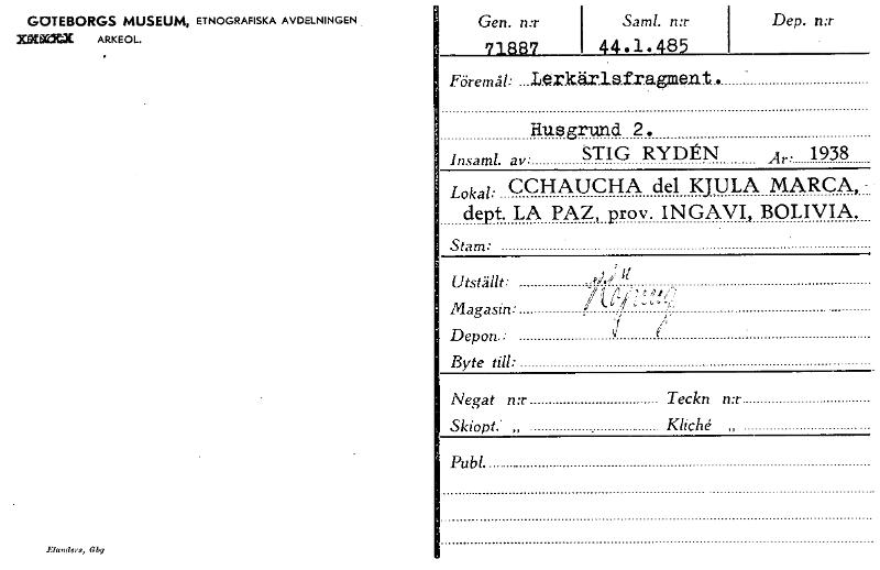 GOTEBORGS MUSEUM, ETNOGRAFISKA AVDELNINGEN XetKOCX ARKEOL. Elanders, 019 Gen. n:r '71887 Sam!. n:r 44.1.485 Dep. n:r Föremål: ....L.OridX.18.fragnelt . Husgrund 2. Insaml. av: STIG RYDÉN År: 1938 Lokal: CCHAUCHA del KJULA MARCA, - dept. LA PAZ, prov. INGAVI, BOLIVIA. Stam: Utställt: .4,/,/ Il Magasin: 1 t /2j::.,''.!%,7 Depon.: Byte till: Negat n:r Teckn n:r Skiopt. „ Kliché Publ. [ocr]