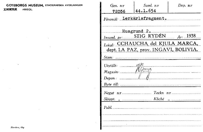 • GOTEBORGS MUSEUM, ETNOGRAFISKA AVDELNINGEN XEKtaTekX ARKEOL. Elnoders, Gbg Gen. n:r 72056 Saml. n:r 44.1.654 Dep. n:r Föremål: Lerkärlsfragment, Rus Insaml. av: STIG RYDÉN Ar: 1938 Lokal: CCHAUC... Visa hela