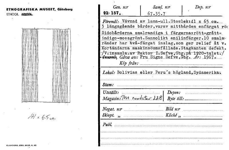 ETNOGRAFISKA MUSEET, Göteborg ETNOGR. ELANDER5. GBG. 8626. 6. 65 Gen. n:r gib 157.. Sam/. n:r i 67.35.7 1 Dep. n:r • Föremål:. Vävnad av lama-ull . Storlek:41 x 65 .c.m. 3 längsgående bårder, varav ...