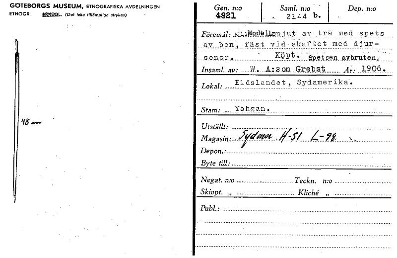 GOTEBORGS MUSEUM, ETNOGRAFISKA AVDELNINGEN ETNOGR. tititagL. (Det icke tillämpliga strykes) Gen. n:o Sam!. n:o - 4821 [ _ 2144 b. Dep. n:o . Föremål: 1,7'11 o.dhllso jut av trå med spets av ben', fäst vid- skaftet med djur- ' KOrt .. --spet-sen avbruten,.. - Insaml. av: Wfl.flflLOfl Grebwt At:. 1906. Lokal: El dslandet , Sydamerika'. Stam: Yahgan. Utställt: Magasin: i 100.4 . I-37 47I \ . Depon.: • Byte till: fl Negat. n:o Teckn. n:o Skiopt. „ Kliché Publ.: [ocr]