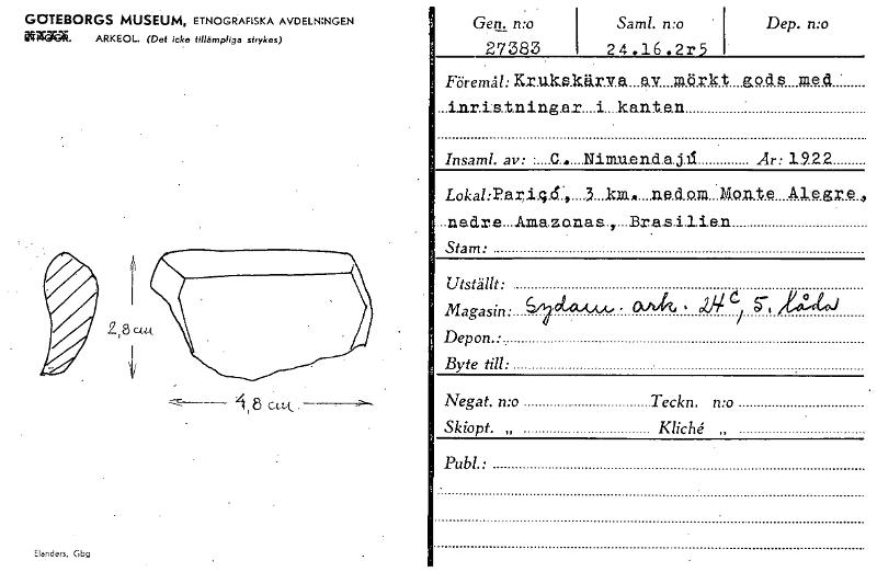 GOTEBORGS MUSEUM, ETNOGRAFISKA AVDELNINGEN iiROUR. ARKEOL. (Det icke tillämpliga strykas) 1,8 . Elands, Gbg Gen, mo 27383 Sam!. n:o . 24.16.2r5 Dep. n:o Föremg: Krukskärva ay mörkt gods med • ...ixtris.t.ning.ar....i....karite.n Insaml. av: - C... .Nirmen.d.a.j.11 Ar: 1.9.22 LokahP.ari.g.d.:,....3...km......n,e.dom Sonte Alegr e , ...nadre...A.mazonas.,...Brasilie.n Stam: Utställt: Magasin: 61ow,. ~k , j., 11.4,1 Depon.: . Byte till: . Negat. mo Teckn. mo Skiopt. „ Kliché „ Publ.: [ocr]