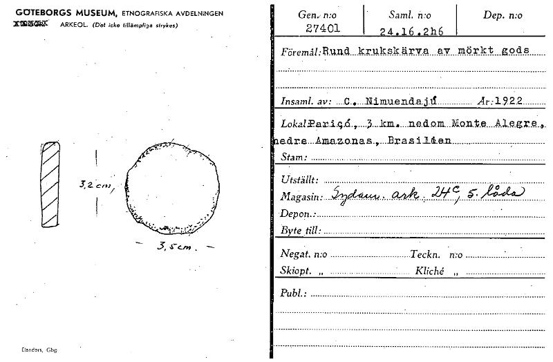 GÖTEBORGS MUSEUM, ETNOGRAFISKA AVDELNINGEN X2:15:Na ARKEOL. (Det icke tillämpliga strykes) 3, a Cli1/ 3, ss- . Elanders, Gbg .., Gen.: n:o 27401 •• - Saml. n:o 24.16.2h6 Dep. n:o Föremä:1311.310, kru...