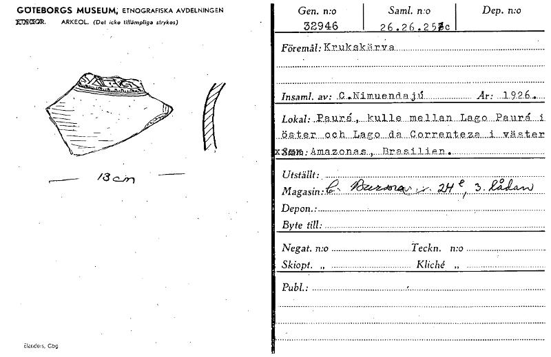 GOTEBORGS MUSEUM; ETNOGRAFISKA AVDELNINGEN KTY3tZaR. ARKEOL. (Det icke tillämpliga strykas) /K3 Elende7s, Gbg Gen. n:o 32946 Saml. n:o 26 . 26 .25%c Dep. n:o Föremål: Kruk,9k.ä.r3.a Insaml. av: .0....Nim.uanda.j..11 Är: ...1.9.2.6....... Lokal: .PAAVY: g.., ku.11e...m.e.1.1.a.n....Lago....r.a.u.r.4...i. öster och LD,go clå Corremtarl A vä?,:t.er ,Sffim:Am.a.z.on.a.s., Brn.sillen. Utställt: Magasin• 2. Depon.: .: Byte till: Negat. n:o Teckn. n:o Skiopt. „ Kliché „ Publ.: , [ocr]