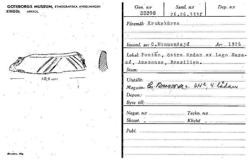 GOTEBORGS MUSEUM, ETNOGRAFISKA AVDELNINGEN XTrEgiS.JR. ARKEOL. 1 I 0,6 lik,“d.r. • , Gb Gen. n:r . 33398 Samt. n:r 26 . 26 . 3 3 3 Dep. n:r Föremål: ..Kr.uks.kär.v.a Insaml. av: 0...Ninu.e.n.d.a.j..a ...