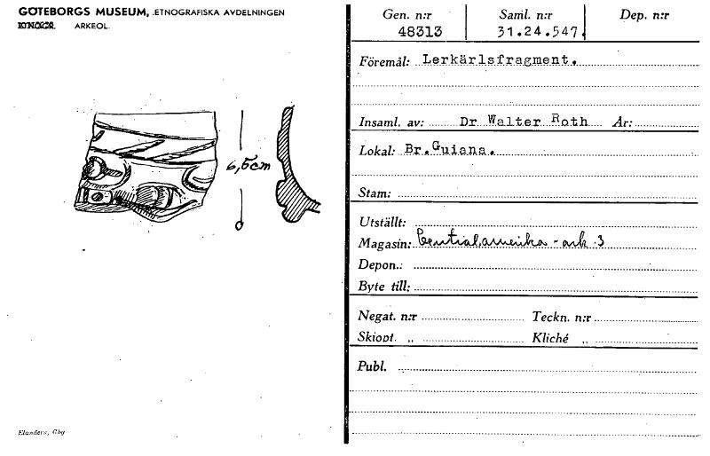 GOTEBORGS MUSEUM, .ETNOGRAFISKA AVDELNINGEN MIOCI. ARKEOL. Elamiera, alv Gen. n:r 48313 Sand n:r 31.24.547 Dep. n:r Föremål: Lerkärlsfragment. Insaml. av: Dr Walter RO.th År: Lokal: Br AG'ulan...