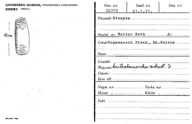 • GOTEBORGS MUSEUM, ETNOGRAFISKA .AVDELNINGEN ntizue.x ARKEOL. Gen. n:r 35370 Sam!. n:r 27.7.77. Dep. n:r Föremål: St enyxa Insaml. av: t År: Lokal:C.onawaraok...River , r...Guiana Stam. Utställt: Mag... Visa hela