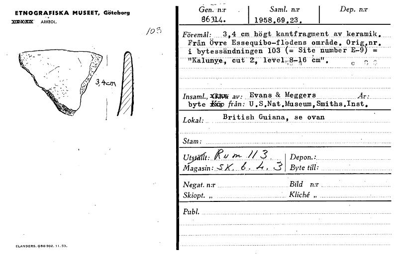 . , Gen. n:r Saml. n:r 86314. 1958.69.23. Dep. n:r ETNOGRAFISKA MUSEET, Göteborg XEINCKet ARKEOL. /9 Föremål: 3,4 cm högt kantfragment av keramik. Från Övre Essequibo—flbdens område. Orig.nr. i bytessändningen 103 (= Site number E-9) = "Kalunge., 1eve1-8-16 Cm". Insaml., XtårPrEi av: Evans & Meggers År: byte Kläp från: U.S.Nat.Museum,Smiths.Inst. Lokal: British Guiana, se ovan Stam: uts : Pv i/ 3 . Magasin: SK., . , Depon.: Byte till: Negat. n:r Bild n:r Skiopt. „ Kliche „ Publ. ELANDERS. GBG 502. 11. 53. [ocr]