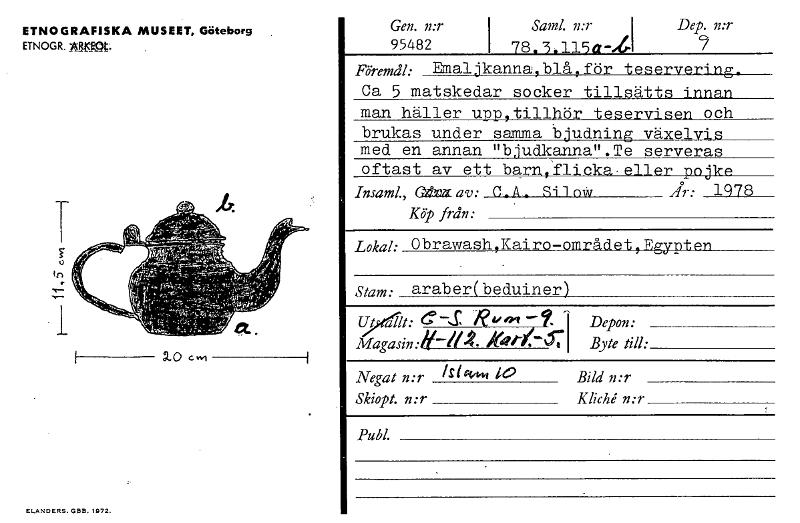 ETNOGRAFISKA MUSEET, Göteborg ETNOGR. Agmt. 10cm ELANDERS.GBE9.1972. Gen. n:r 95482 Saml. n:r Dep. n:r I 78.3.115a-J Föremål. Emaljkanna,blå,för teservering. Ca 5 matskedar socker tillsätts innan man häller upp,tillhör teservisen och brukas under samma b'udnin. växel • med en annan "bludkanna".Te serveras oftast av ett barn,flicka.eller pojke Insaml., hav: C_ A . Si 1 n* JA- 1978 Köp från: Lokal: Obrawash, Kairo—området Egypten , Stam: araber( beduiner) Ut allt: e -S, Rd, epr --1, Depon • Magasin • »r/47 It'llt i Byte till: Negat n:r 41 kim 10 Bild n:r Skiopt. n:r Klichén:r Publ. [ocr]