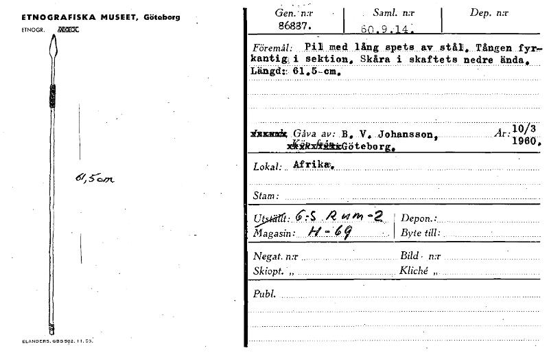 • _ Gen.- n:r 86887. Sand. rix ån .9 .14. Dep. n:r ETNOGRAFISKA MUSEET, Göteborg ETNOGR. HDOC Föremål: Pil med lång spets av stål. Tången fyr— kantig, i sektion. Skåra i skaftets nedre ända. Län.gd:: ... Visa hela