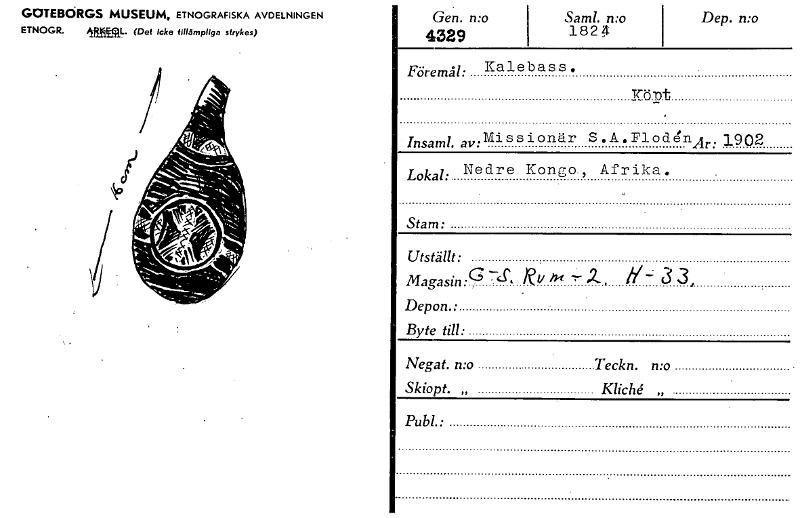 • GOTEBÖRGS MUSEUM, ETNOGRAFISKA AVDELNINGEN ETNOGR. IfirstaL. (Det Icke tillämpliga strykes) Gen. n:o 4329 Saml. n:o 1824 Dep. n:o Föremål: Kalebass. .A.FlodenAr: Missionär S Insaml. av: 1902 Lokal: ... Visa hela