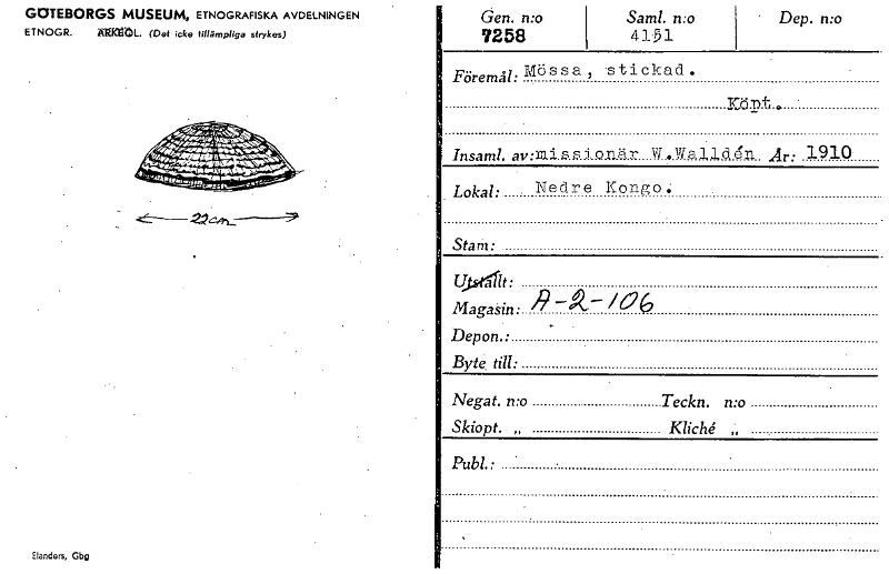 GOTEBORGS MUSEUM, ETNOGRAFISKA AVDELNINGEN ETNOGR. AVAIML. (Det icke tillämpliga strykes) Elanders, Gbg öen. n:o 7258 Sam!. n:o 4151 • Dep. n:o Föremål: Mössa 2 stickad. KÖ -1) tt . p • . , Insaml. av:ial.,.5.3 i Q.n..ä r W el.ri al, ld en Är: 1910. Lokal: Nedre Kongo Stam: Uptdlt: Magasin: '------"-- /06 Depon.: Byte till: • Negat. n:o Teckn. n:o Skiopt. „ Kliché ;, Publ. • . • [ocr]