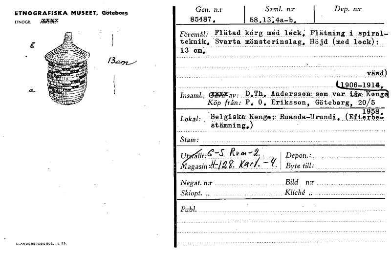 ETNOGRAFISKA MUSEET, Göteborg ETNOGR. ATtmx g a_ Gen. n:r I Sam!. n:r I Dep. n:r 85487. I 58,134a—b, Föremål: Flätad körg med lack; Flätning i spiral- teknik. Svarta mönsterinslag„ Höjd (med lock): 13 cm, vänd) 906-1914, Insaml., $37vTaz av: D,Th, Andersson: som var. ikr: Kong Köp från: P„ 0, Eriksson, Göteborg, 20/5 1958, Lokal: Belgiska Kongo:: Ruanda—Urundi (Efterbe- stämning.) Stam: Ut allt g magasin:Ib-Jag ,e4ti Depon.: Byte till: Negat. n:r Bild n:r Skiopt. „ Kliché„ Publ. ELANDERS. 060 502. Il. 53. [ocr]