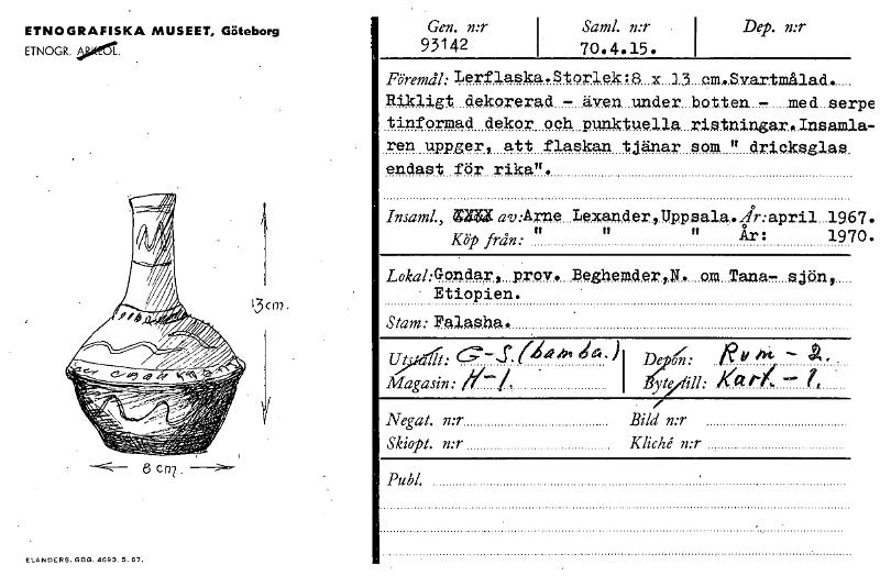 ETNOGRAFISKA MUSEET, Göteborg ETNOGR. >e_ 13cm. CP7. Gen. mrSaml. mr • I L4,14 1LT I 93142 70.4.15. Föremål: Lerflaska. Storlek :8 x. 13 cm...Svartmålad. Rikligt dekorerad - även. under lotten - med ..serpe tinformad dekor och punktuella ristniugar.Insamla- ren uppger, att flaskan tjänar som " dricksglas. endast för rika". grilav:Arns Lexaud.ery.U.p.psal.a..yir:april...1967. Köp från:tl ft År: 1970. LokahGondar, prov. BeghemderIN. om Tana- sjön, Etiopien. Ut Klam da-)1 D5pKi: t Magasin: g—./, I åkte ill: 1-1. • Negat. n:r Bild n:r Skiopt. n:r Kliché n:r Publ. Stam: Ealasha. ELANDERS. GBG. 4693. 5. 67. [ocr]