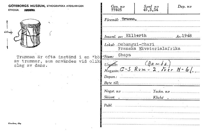 GÖTEBORGS MUSEUM, ETNOGRAFISKA AVDELNINGEN ETNOGR. Älg" Gen. n:r 77825 Saml n:r 49 .5.54 Dep. n:r Föremål: Trumma. av: :n Insaml. av ib ert h. LOkal: Franska Ekvatorialafrika con År:19 4.8 Trumman ...