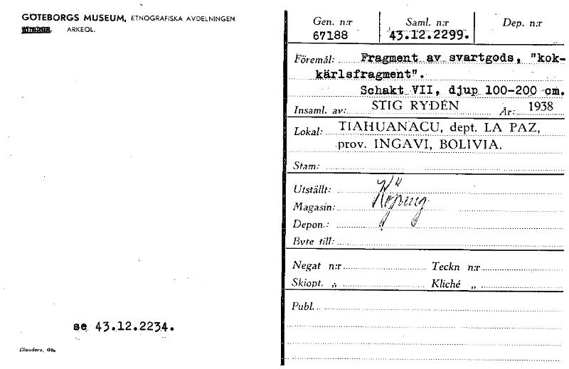 • GOTEBORGS MUSEUM, ETNOGRAFISKA AVDELNINGEN rna ARKEOL. Gen. n:r 67188 Sam!. n:r 43-.12.2299: Dep. n:r Föremål: Fragment av_ svartgods "kok- kärlefragment!' . Schakt. VII , dju.p 100-209 '01* STIG RYD... Visa hela