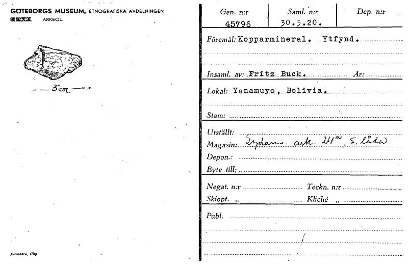 • GOTEBORGS MUSEUM, ETNOGRAFISKA AVDELNINGEN SQX22. ARKEOL. Gen. n:r 45796 Samt. n:r 30.5.20. Dep. n:r — 5 Föremål: Ko.p.p.arminer.ai. rtfynd. hisam/. av: .Fritz....Buc.k.. År:. Stam: Utställt: Magasin... Visa hela