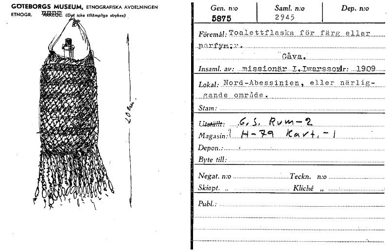 GOTEBORGS MUSEUM, ETNOGRAFISKA AVDELNINGEN ETNOGR. %ZUR (D Icke tillämpliga strykas) • r Gen. n:o 5875 Saml. n:o 2945 Dep. n:o Toalettflaska för färs elle Föremål: eller pa324,tra;.,,;„ Gåva, Insaml. ...
