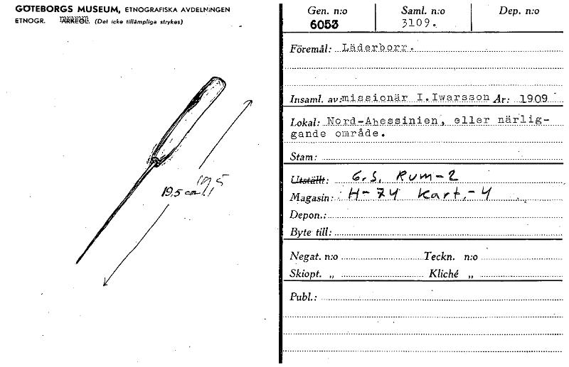 • GOTEBORGS MUSEUM, ETNOGRAFISKA AVDELNINGEN ETNOGR. 71i2WE111.. (Det icke tillämpliga sfrykes) Gen. n:o 6053 Saml. n:o 310 9 0. Dep. n:o Föremål: Läderbor-r. Insaml. av:mis s i onär I.Iwarsson Ar: ..1... Visa hela