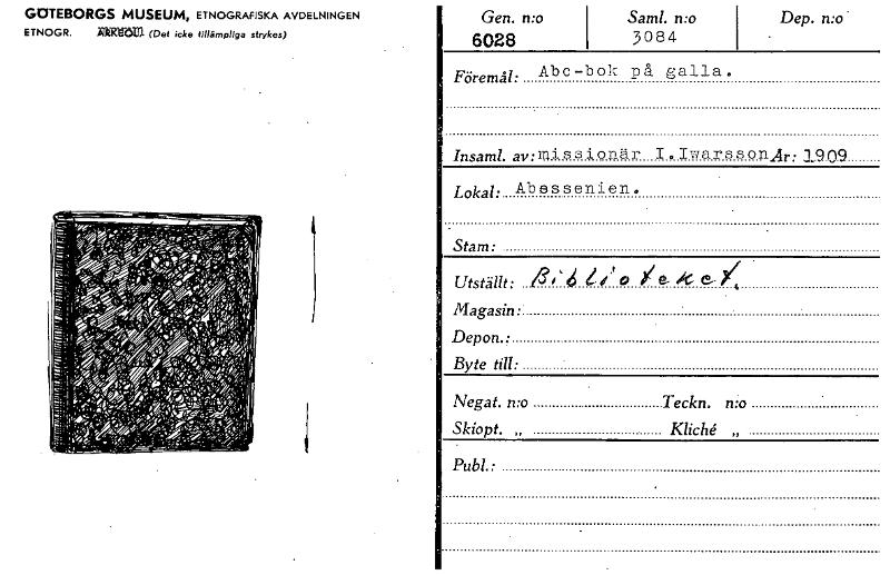 • GÖTEBORGS MUSEUM, ETNOGRAFISKA AVDELNINGEN ETNOGR. fflbsTegai (Det icke tillämpliga strykes) Gen. n:o Saml. n:o 6028 3084 Dep. n:o. Föremål: Abc-bok -nå galla. Insaml. ^ion.är I P IvrarssonAr:1.9.0.9... Visa hela