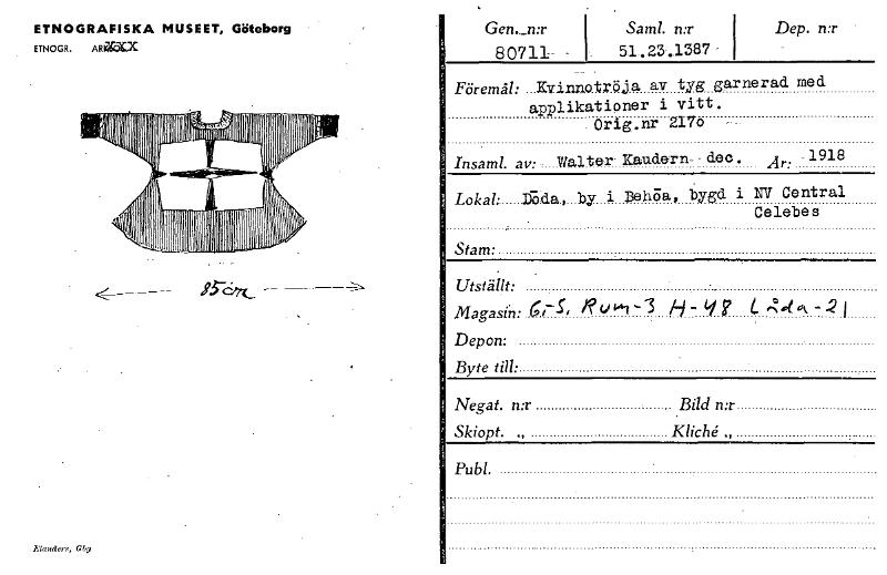 Gen....n:r Saml. n:r 80711 - 51.23.1387 Dep. n:r ETNOGRAFISKA MUSEET, Göteborg ETNOGR. ARIEKX :,111/0.1101"1'411111111111'''' Elander,, Föremål: Kvinnotröja av tyg garnerad med. applikationer i vitt. Orig.nr 2170 Insaml. av: Walter Kaudern- d.ec. År: -1918 Lokal: D-oda, by i Behaa, bygd i NIT Central Celebes Stam: Utställt: Magasin: 6(--5, 1?9 H- V? -Z•tiN- 2 j Depon: Byte till: Negat. n:r Bild mr Skiopt. „ Kliché„ Publ. [ocr]