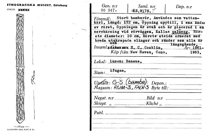 ETNOGRAFISKA MUSEET, Göteborg ETNOGR. XXXXX ELAN DERS. GBG. 5687. 8. 61. Gen. n:r 88 947. Saml. n:r I Dep. n:r Föremål: Stort bamburör. kärl, Längd:: 1172'' cm. Öppning Användes och Kallas och ränder Conn. upptill, söm vatten- i ena änd är placerad i e: galiiwoR„ Rör- av röret. Öppningen är oval nerskärning vid: rörväggen. ets diameter: 10) cm. Röreter breda: ut krapade: slingor oo Insaml.gurziautXDOL II.. C_,.Conklin, . Köp från:Neve Haven.. utsida-- ornerat med-- som alla är längsgående , - Ar: 1961. 1963. Lokal: Luzon:: Banaue, Stam: ifugaa. . ,. U allt:' 6 - t (baMin) Magasin: Rum-a, AjitK3 Depon.: Byte till: Negat. n:r Bild n:r Skiopt. „ Kliché,, Publ. _ ---- [ocr]
