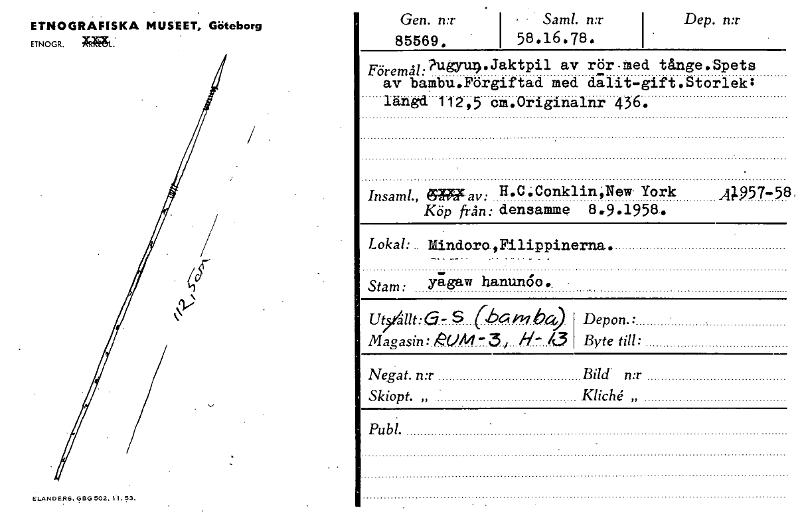 ELANDE/25. GBG 502. 1.53. Depon.: Byte till: - Stam: yagaw hanuncio Föremål: .Jaktpil av rör • med tånge 'Spets ?u Krm> av bambu.Förgiftad med dilit-gift . Storlek langd 112,5 cm.Originalnr 436. ~ av: H.0 4onklin;New York Insaml., .4957-58, Köp från: densamme 8.9.1958. Lokal: Mindoro ,Filippinerna. ut,Ant:G- S Magasin: te0M-5, H- /.3 Negat. n:r Bild. n:r Skiopt. „ Kliché „ Publ. ETNOGRAFISKA MUSEET, Göteborg ETNOGR. Gen. n:r 85569. • Sam!. n:r 58.16.78. Dep. n:r [ocr]