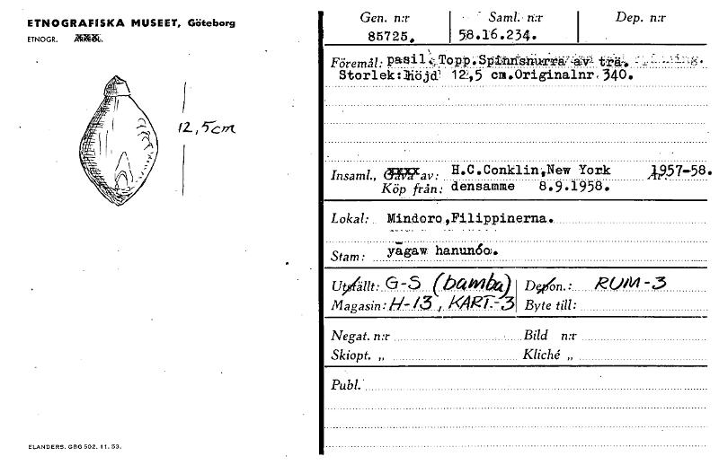 Gen. n:r I Saml.. ri:r I Dep. n:r 85725„ i 58.16.2.34. ETNOGRAFISKA MUSEET, Göteborg ETNOGR. akUrb. Föremål: pasil.; Topp .Spitlisnurral-s\K Storlek :1-iöjd3 12.,5 ca.Originalnr, 340. H.C.onklinOew York Insaml., ~av: C 19.57-58• Köp från: densamme 8.9.1958. Lokal: Mindoro Filippinerna. 12 ,5"-circ stam: yagaw hantni6o). U0nt: G-5 (banA) magasin:H- /3 i MR77-:3 D96n.: ROM -€.3 Byte till: Negat. n:r Bild n:r Skiopt. „ Publ. ELANDERS. GDG 502. 11. 53. [ocr]