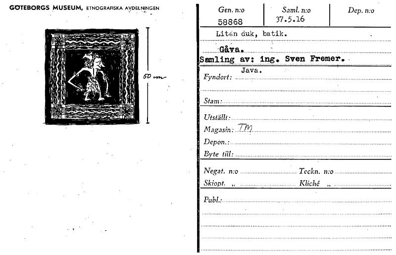 • GOTEBORGS MUSEUM, ETNOGRAFISKA AVDELNINGEN Gen. n:o 58868 Saml. n:o 37.5.16 Dep. n:o Liten duk, batik. "ablj.4 Samling av: ing. Sven Fremer.. Java. Fyndort: Stam• Utställt: Magasin: 7-71 Depon.: Byte... Visa hela