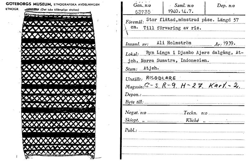 Dep. n:o Gen...n:o 63735 Saml. -n:o 1940.14.7. GOTEBORGS MUSEUM, ETNOGRAFISKA AVDELNINGEN ETNOGR. eihRiff~ (Det icke tillämpliga strykes) nY ava&Ö''.41. 44■17011.4174;":4■4V419~41nine .A ^^^^•:•■& Föremål: Stor flätad,mönstrad påse. Längd 57 A cm. Till förvaring av ris. Insaml. av: Ali Holmström Är: 1939. ^nå 4,1rAnKt 47"4"0441¥7Ke4"1.22;8■ Ae Ah A. A Å 41. WrA,■■■■■■■Arder..3501.15.3!~-^11 ‘vs`W.v.'434"*"■'■«"Vf■ nookle.v.v."40.- thtimor_e7.79 = = P&Iirke-^ii-r■*-^■■••■•.74—v.v4v4‘"ji •:•YrAX•v0 ... A .11...Å.ÅVÅ.Å.Å,Å1P■TÅTÅTAYPÅVÅ.IPÅVÄ AAIIIAAÄAWA;&NrAIWrÄÄ■nr; AVÅYÅWÅVÅ‘ÅVÅVÅVid kVA:VALV" LT/bW2 I;Å9Å.Å.Å."41Y21517.0 PAY/11,1.2W IV Lokal: Byn Linga i Djambo Ajers dalgång, At- jeh, Norra Sumatra, Indonesien. Stam: Atjeh. Utställt: RISObt_nRE Magasin:— S 9, H -- .e 7, 2., Depon.: Byte till: Negat. n:o Teckn. n:o Skiopt. „ Kliché Publ.: [ocr]