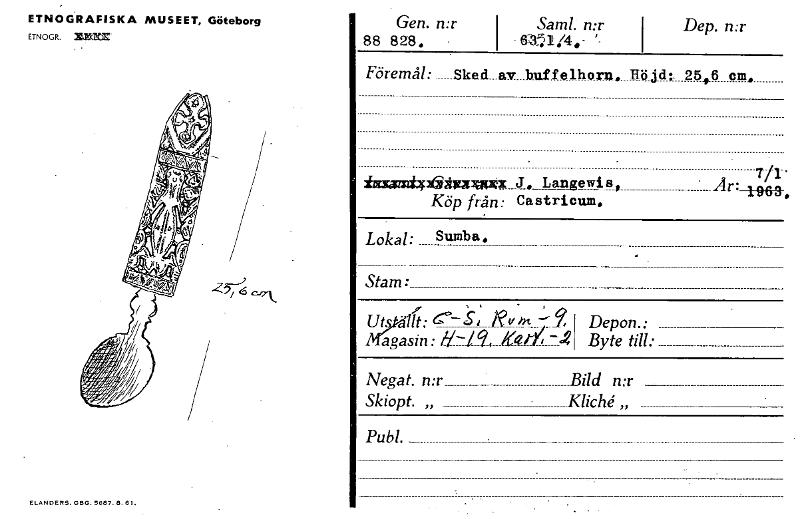 ETNOGRAFISKA MUSEET, Göteborg ETNOG R. XXIKZ ELANDERS. GAG. 5667. 8. 61. Gen. n:r 88 828. • Sam!. n:r -64114,- '- 1 Dep. n:r Föremål: Skest..av buffelhorn, Höjd:. - ituranzipagitaninx J._ Laugewis, Köp från: Castricum. 25+6 cm, VI . Ar: 19G3 Lokal: Sumba„ Stam: • p011t: 6c"-S, _igt, ni .7 9 Magasin: il__-:19_,___darr, -.2 Depon.: Byte till: Negat. n:r_ Bild n:r Skiopt. „ Kliche' „ . Publ. . [ocr]