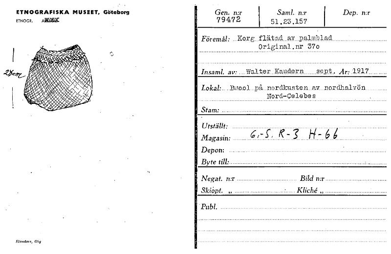 • ETNOGRAFISKA MUSEET, Göteborg ETNOGR. AKEIra Gen. n:r 79472 Saml. n:r 51.23.157 Dep. n:r Föremål: ...Korg flätad av palmblad Original.nr 37o Insaml. av: Walter Kaudern sept . An, 1917 Lokal. Bwaol... Visa hela