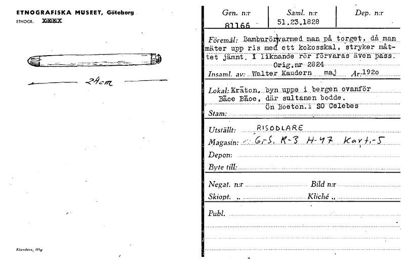 ETNOGRAFISKA MUSEET, Göteborg E TNO GR. XXXLX Effinders, Glys Gen. n:r i"-li 1 6 6 - Saml. n:r 51,23,1828 Dep. n:r Föremål: Bamburö armed man på torget, då man mäter upp ris me ett kokosskal, stryker...
