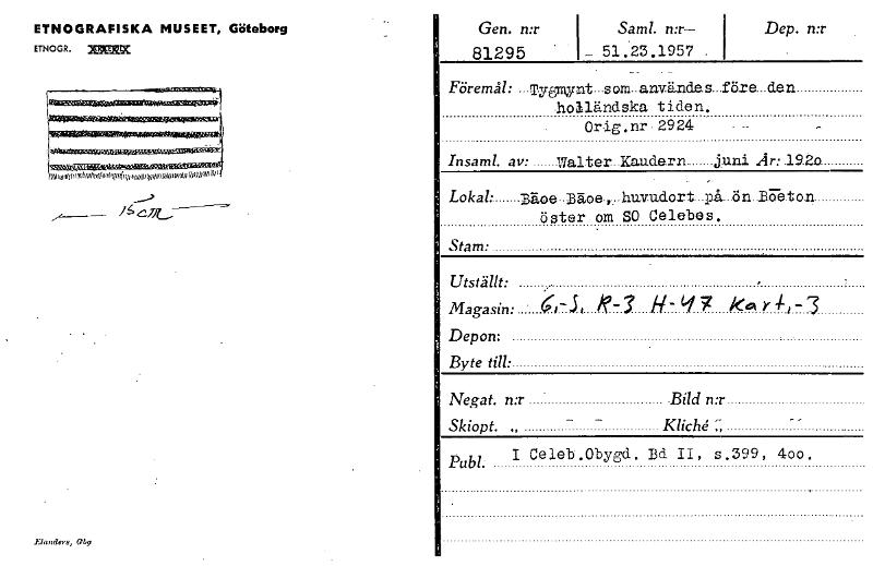 ETNOGRAFISKA MUSEET, Göteborg ETNOGR. xxgx.x Ralik4~~~typegsingssisnescsåk Gen. n:r Saml. n:r— Dep. n:r 81295 51.23.1957 -- - Föremål: . Tygnlynt .som.. a ny ämde _f ö.r de n holländska tiden, Orig.nr, 2924 IN40000014,phymmwmpwimmiwyp Insaml. av: Walter Kaudern juni Ar: 192o Lokal: Bijoe BEtoe, huvudort på ön B cTe t o n öster om SO Celebes. Stam: Utställt: Magasin: . .. .............. .... H- Ll kol r 4-, - Depon: Byte till: Negat. n:r Bild n:r Skiopt. Kliché Publ. I Celeb.Obygd. Bd II, s.399, 400. Elanders, Gbry [ocr]