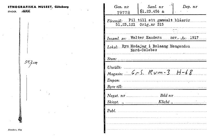 • ETNOGRAFISKA MUSEET, Göteborg ETNOGR. miau Gen. n:r Saml. n:r 79778 1.23.456 a- Dep. n:r Föremål: Pil till ett gammalt blåsrör 51.23.121 Orig.nr 315 Insaml. av: Walter .Kaudern nov..A.: 1917 Lokal:... Visa hela