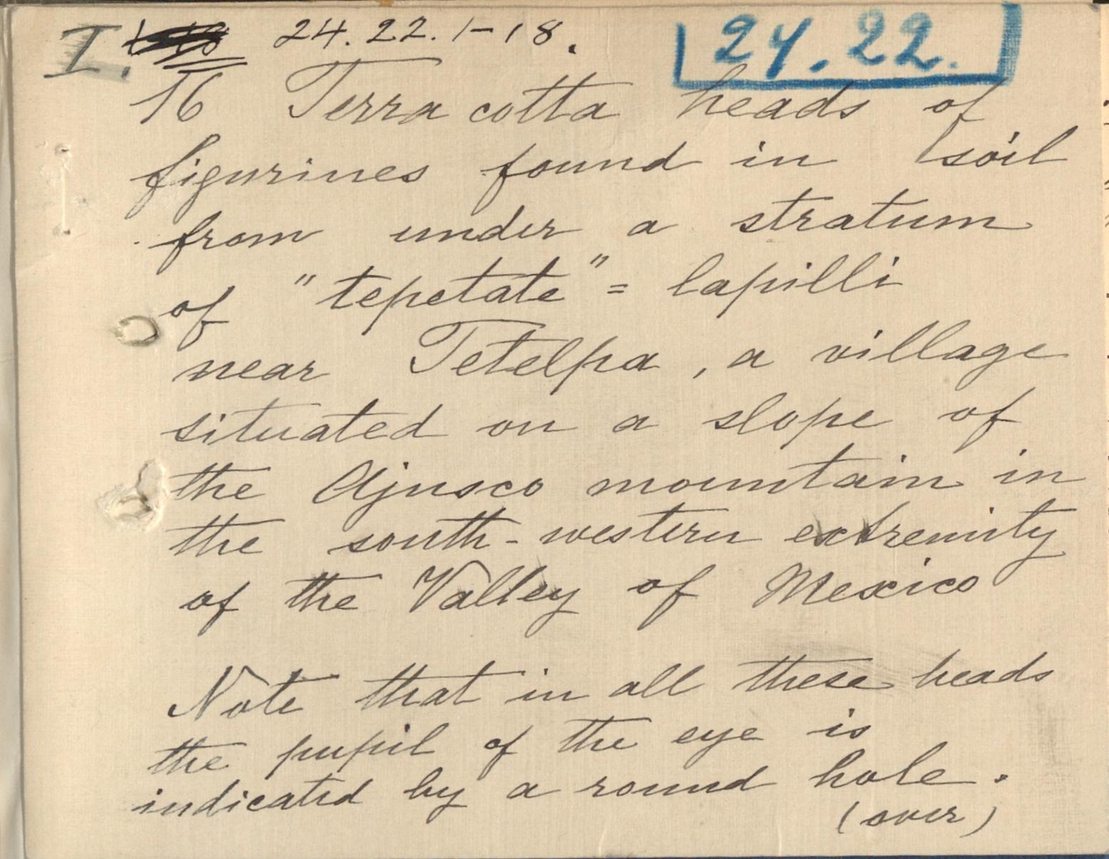 Terra cotta heads of figurines found in soil from under a stratum of "tepetate" = lapilli near Tetelpa, a village situated on a slope of the Ajusco mountain in the south-western extremity of the Valley of Mexico. Note that in all these heads the pupil of the eye is indicated by a round hole. Found by Zelia Nuttall in january 1924.