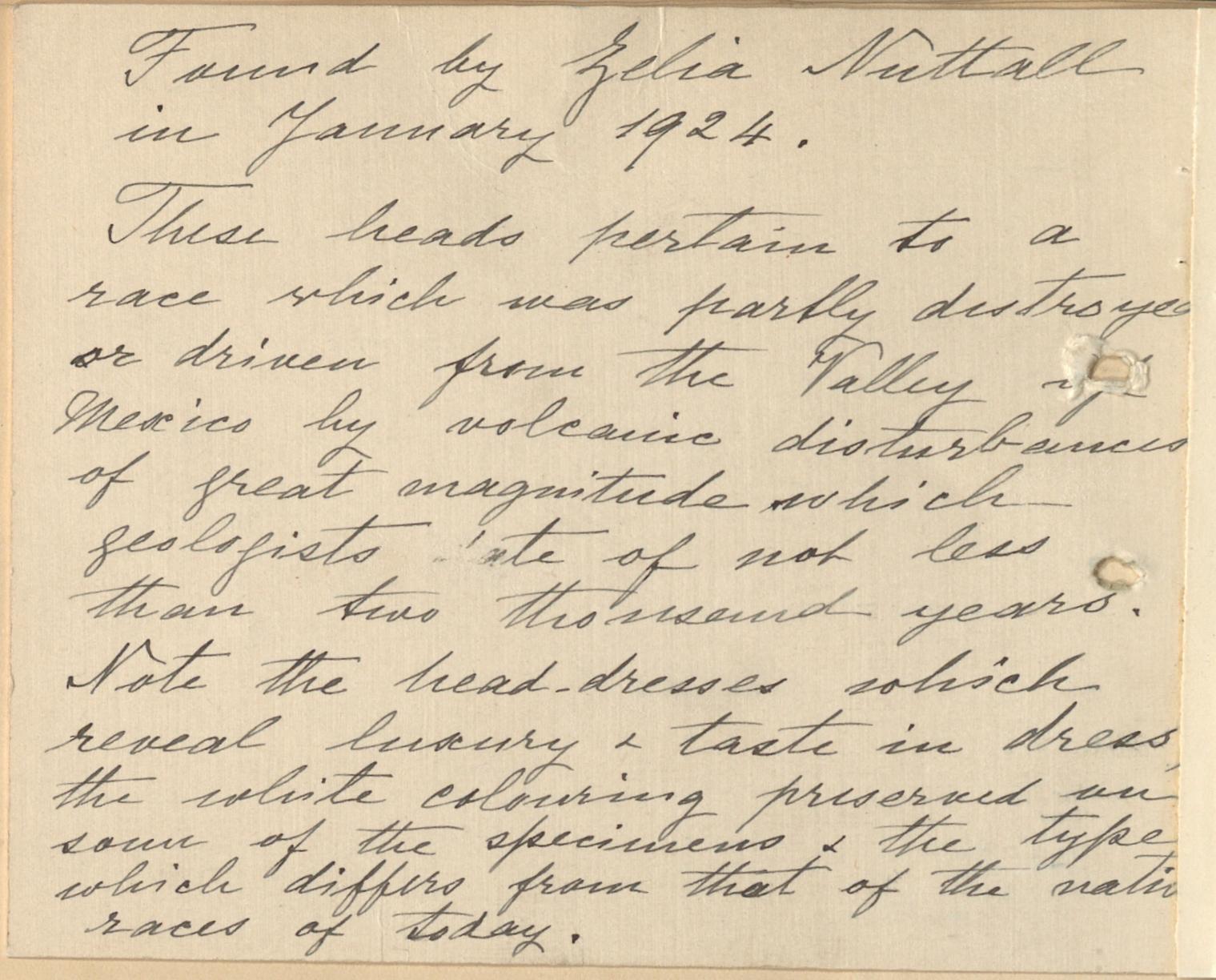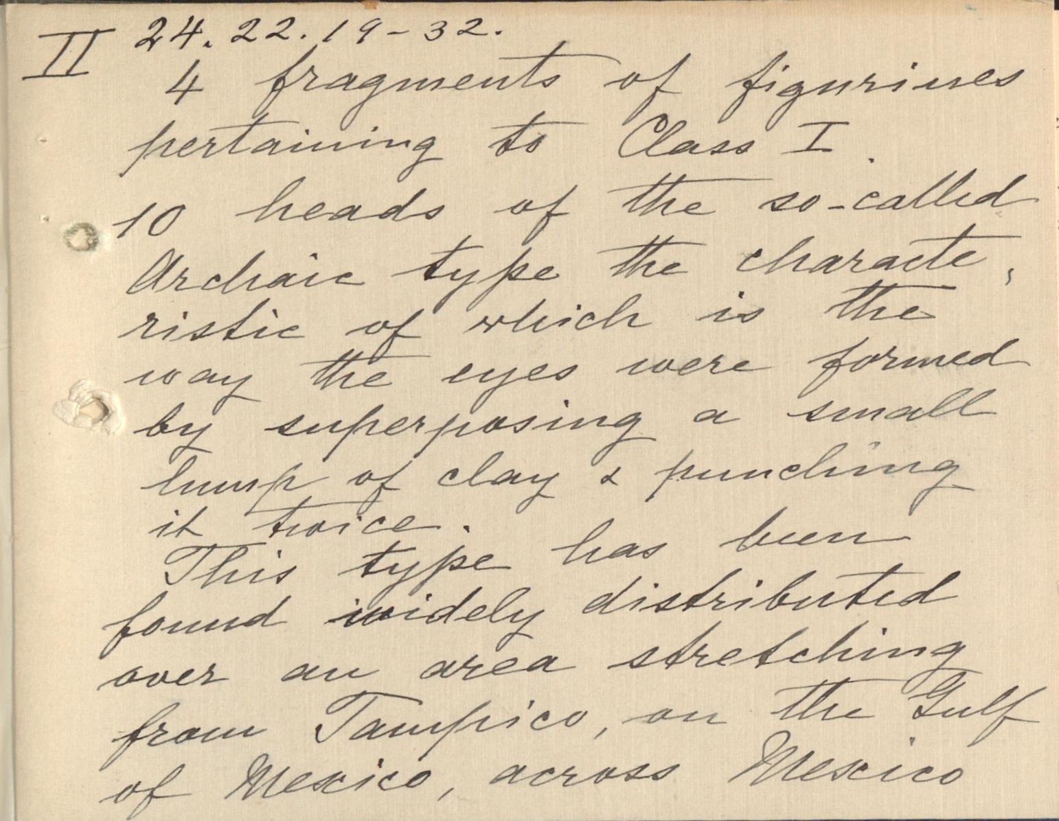 Fragments of pottery and obsidian flakes and two heads of Type I, a figurine much water-worn found by Mrs. Nuttall during the excavations she made in January 1924 in her orchard under a portion of a lava flow dated by geologists as not more recent than 2000 years and possibly much older.